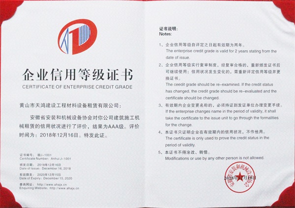 黃山市天鴻建設(shè)工程材料設(shè)備租賃有限公司——2018安徽省建筑施工機械租賃AAA級信用企業(yè)