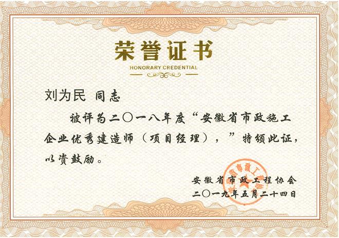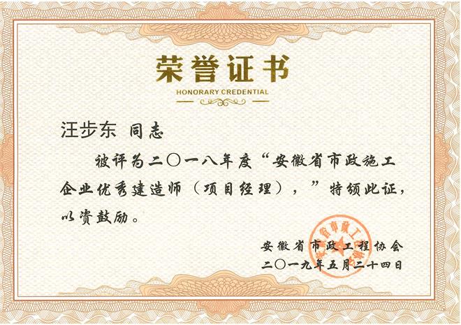 歙縣市政工程類項目“優(yōu)秀項目經(jīng)理”—張金龍