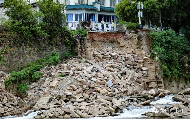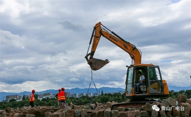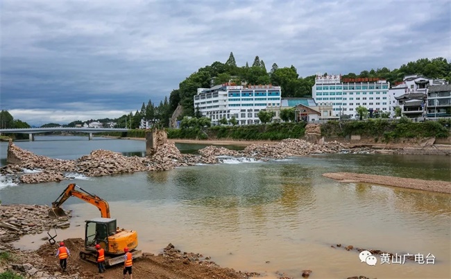 在打撈散落在水里的鎮(zhèn)海橋構(gòu)件、石料的同時,黃山市還對鎮(zhèn)海橋殘存橋體兩邊部分進行臨時加固。
